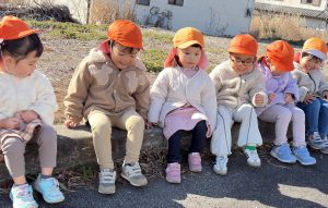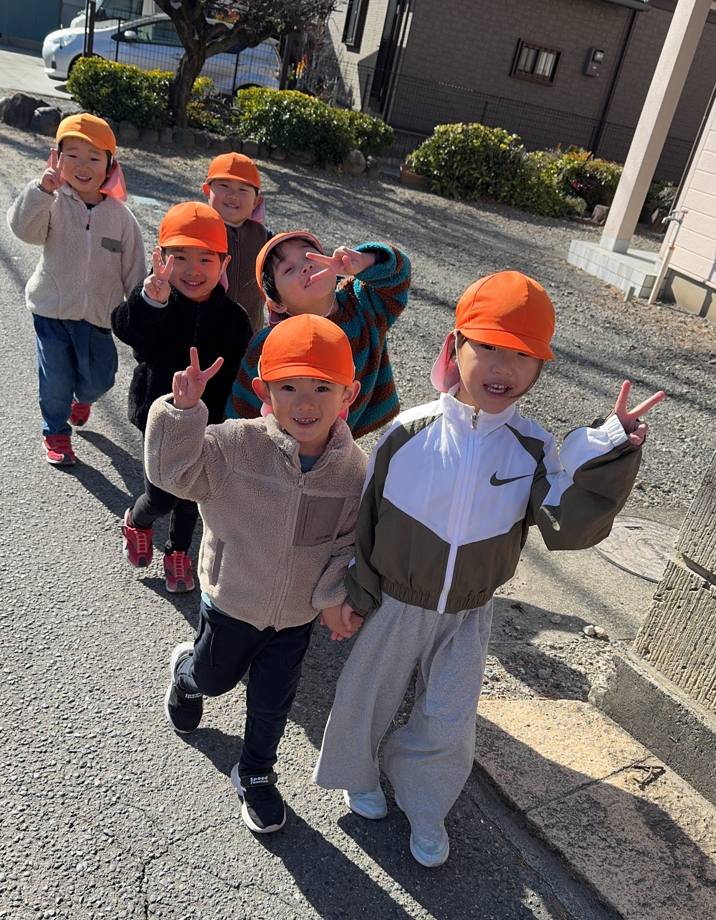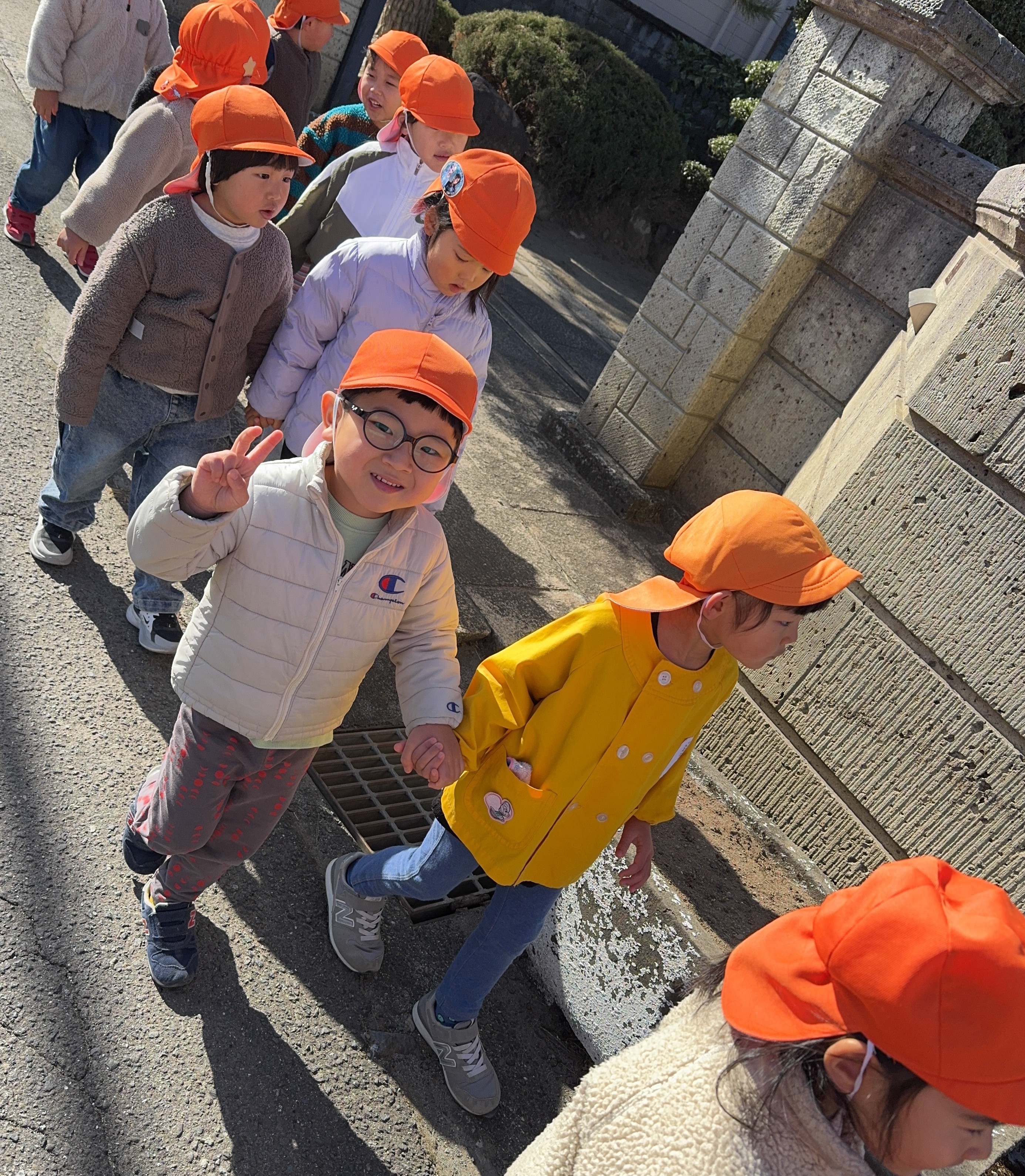 1月後半は寒い日が多かったですが、ある暖かい日にお散歩に行ってきました。歩くことが上手になってきたので、短い距離ですが全員が順番で歩きました。保育者と手をしっかり繋いで上手に歩くことができました!