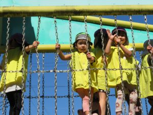待ちに待った大型遊具では、始め階段の高さに「うわ~。高いな~」としり込みしていた子もいましたが、すぐに楽しさが勝り、歓声を上げながら何回も滑り台を滑っていました。