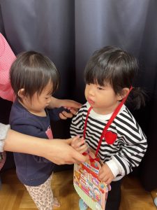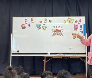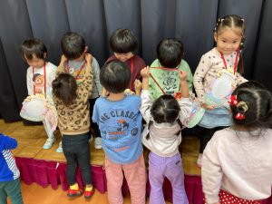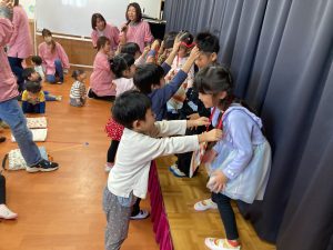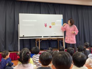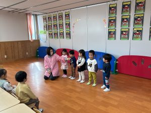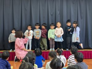 先生からの出し物は「魔法のくれよん」 ♪どんな色がすき♪の歌を歌いながら、動物さんたちのプレゼントを取り戻しました! みんなで一緒に歌ってくれて、ありがとう♡