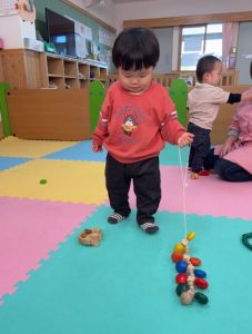 お部屋で遊ぶ様子も、お友だちや保育者とのやりとりを楽しむ姿が増えてきましたよ!そして、遊び方も少しずつ変わってきています。靴下やズボンも自分で脱げるようになってきて、遊んでいる間に挑戦する時もありますよ!