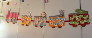 10.11月の製作で、足形手形がかわいい動物たちに変身しました。お遊戯会の曲「どうぶつでんしゃがやってきた」を踊る様子をお部屋で応援してくれましたよ!