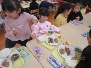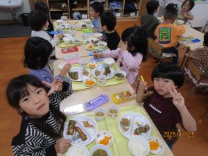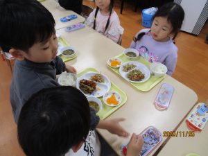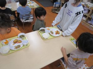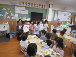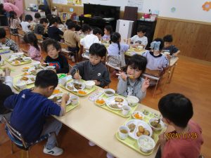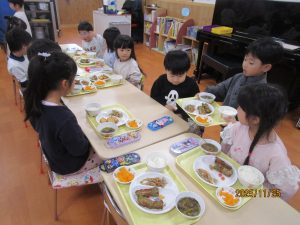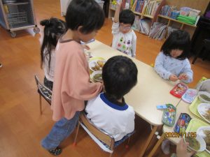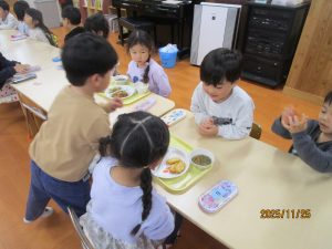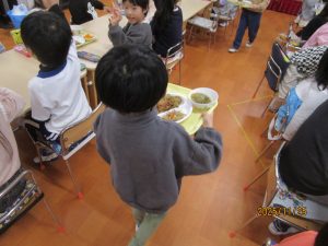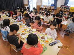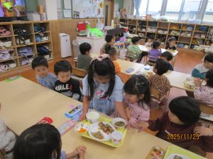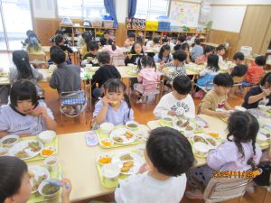 さくら組とひまわり組は合同で給食を食べましたよ。