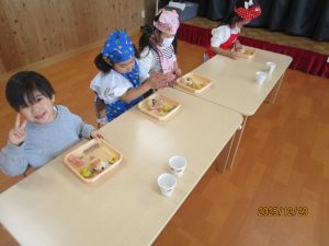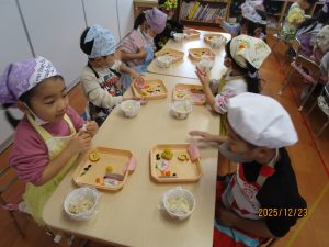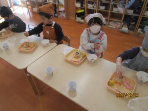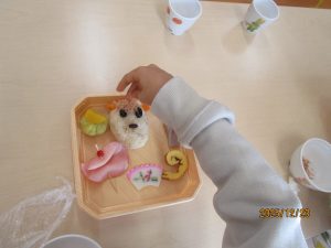 さくら組さんの子が手綱こんにゃくを午のおにぎり🐴の上に乗せていたので、「どうしてここに乗せてるの?」と尋ねると「三つ編み~!」と返答が・・・。