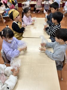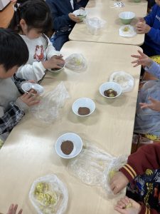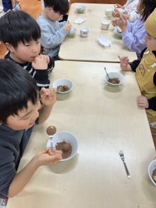 ピュアココアとミルクココアを混ぜたものを用意したのですが、”苦い!”という子が何人かいたので、砂糖をプラスしてあげると「美味しい」と言っていました。