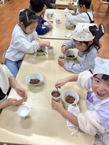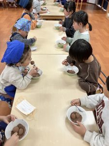 口の周りを黒く(ココア)して食べている子どもたちがとても可愛かったです(*’▽’)