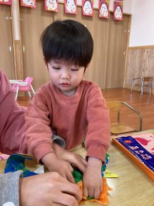 赤色、青色どっちがいいのか聞くと「こっち!」と教えてくれて興味津々で取り組んでくれました。