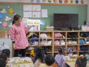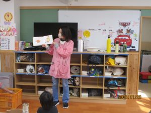 短いお話なので、つぼみ1組(1歳児)クラスにもお邪魔して読んでもらいました。