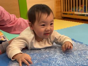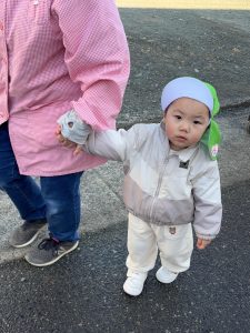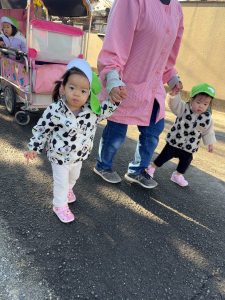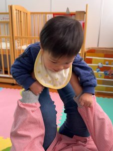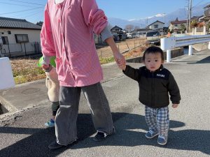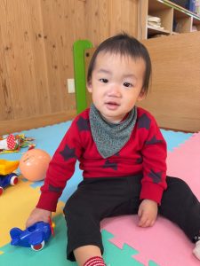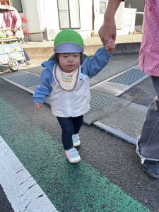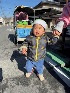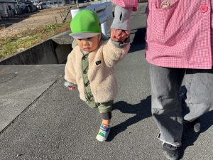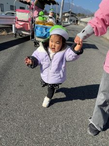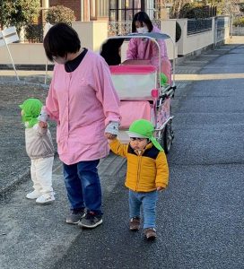 1月後半は寒い日が多かったですが、ある暖かい日にお散歩に行ってきました。歩くことが上手になってきたので、短い距離ですが全員が順番で歩きました。保育者と手をしっかり繋いで上手に歩くことができました!