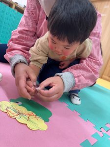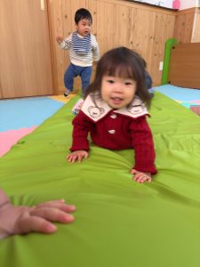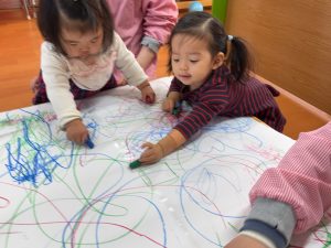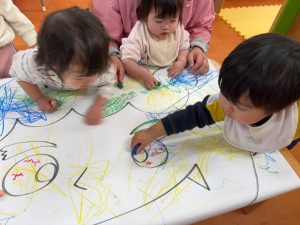寒い日はお部屋で身体をマットなどで動かして遊んだり、クレヨン遊びをしたり、節分にむけて鬼のお面を作ったりしながら楽しく過ごしています。