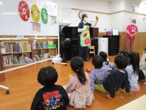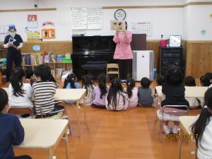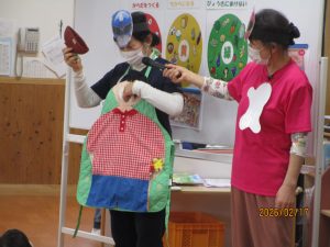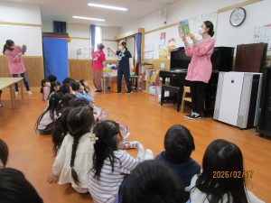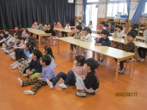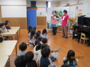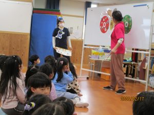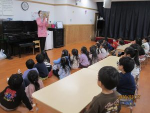 私たちの体は、毎日食べる食べ物からつくられています。今回は、担任の先生がしまじろうの紙芝居を読み、健康な体を保つためには正しい食生活が大切であることを子どもたちに伝えました。