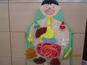 また、青レンジャー(看護師)からは、口に入った食べ物がうんちになるまで体の中の道すじについて話しました。