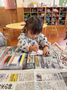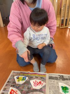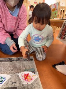霧吹きから水が出てくるのを見て、「わぁ~!」と言ったり、模様がにじんでいく様子を見て不思議そうにしたりしていました。