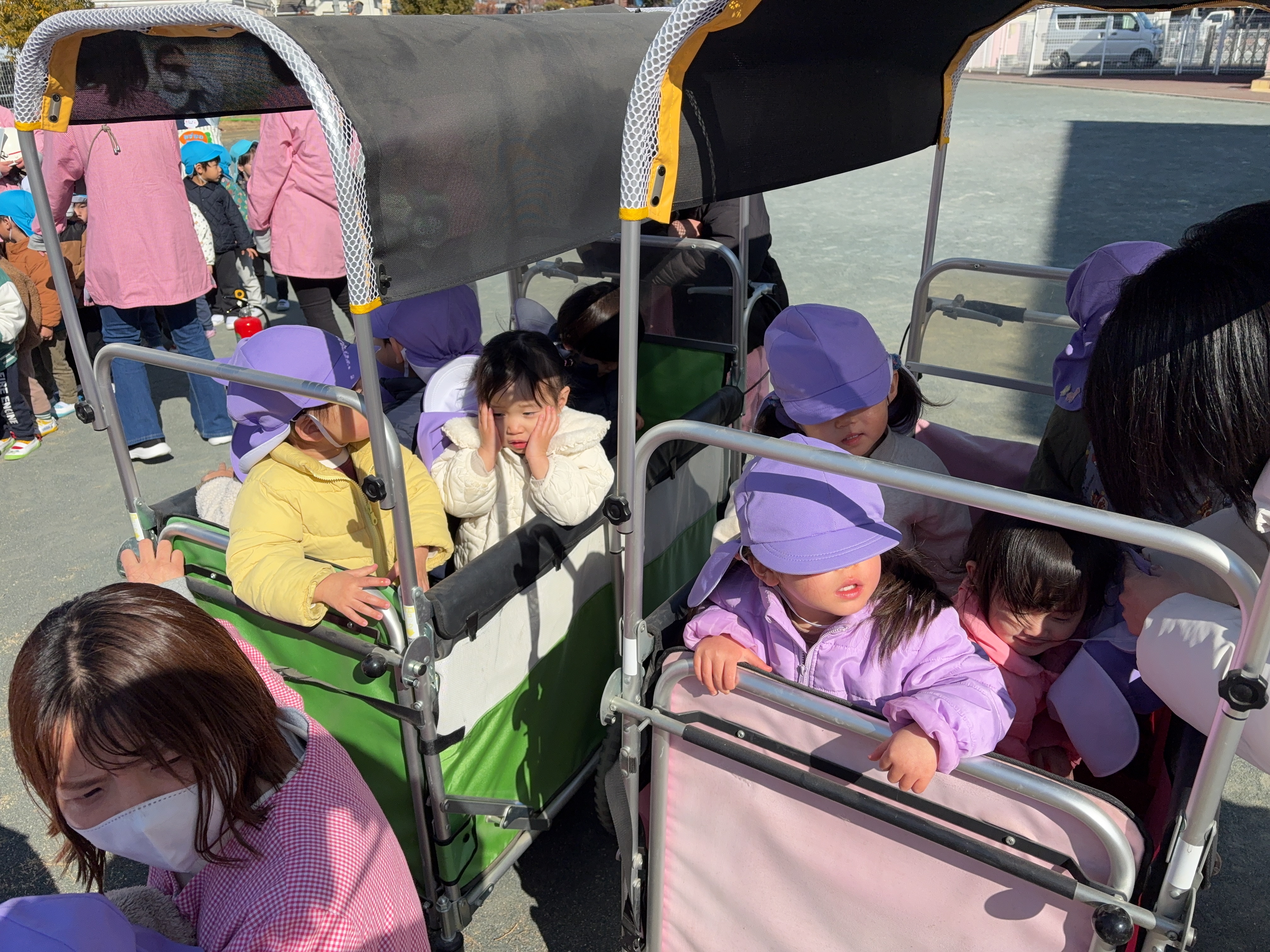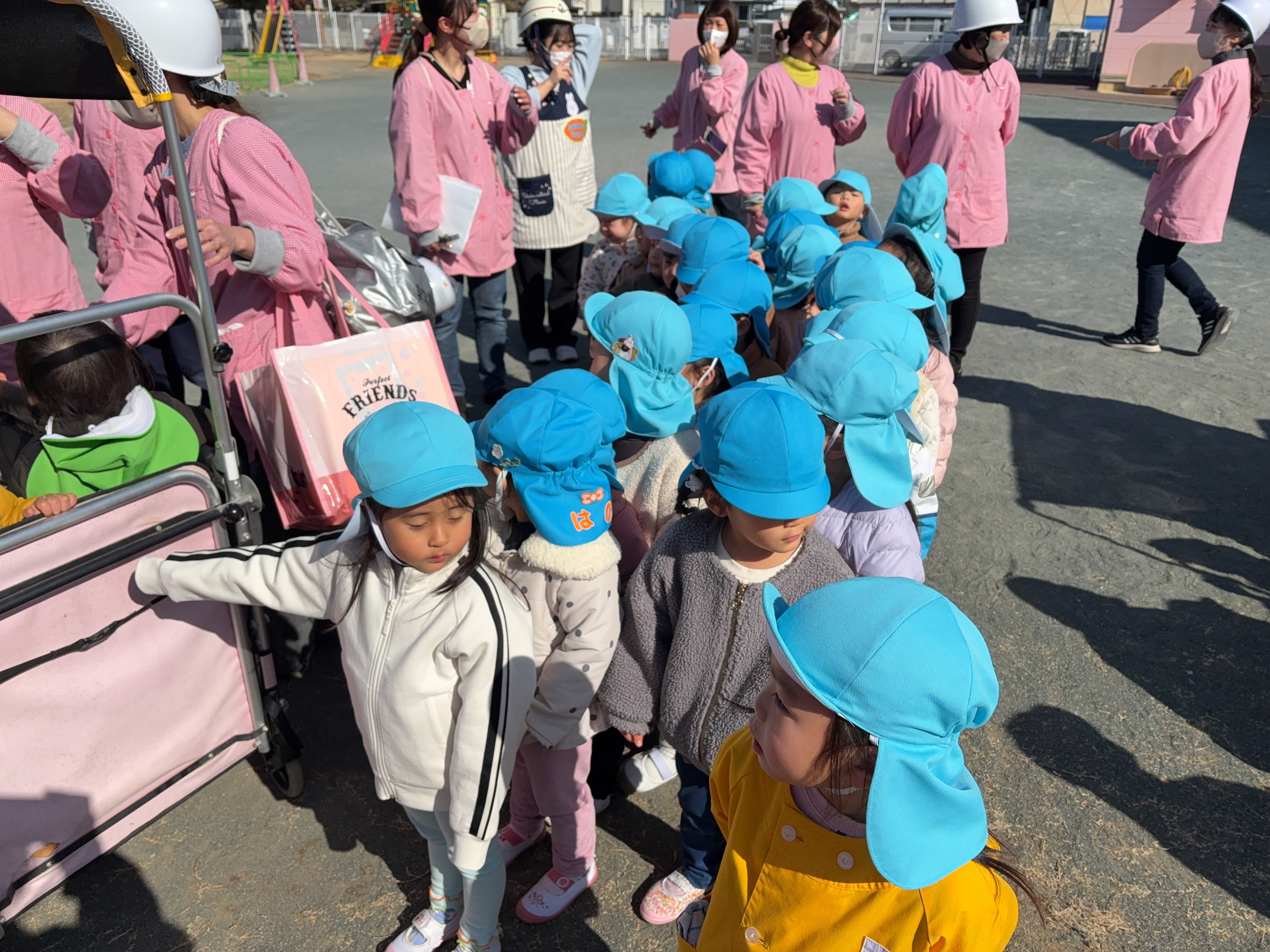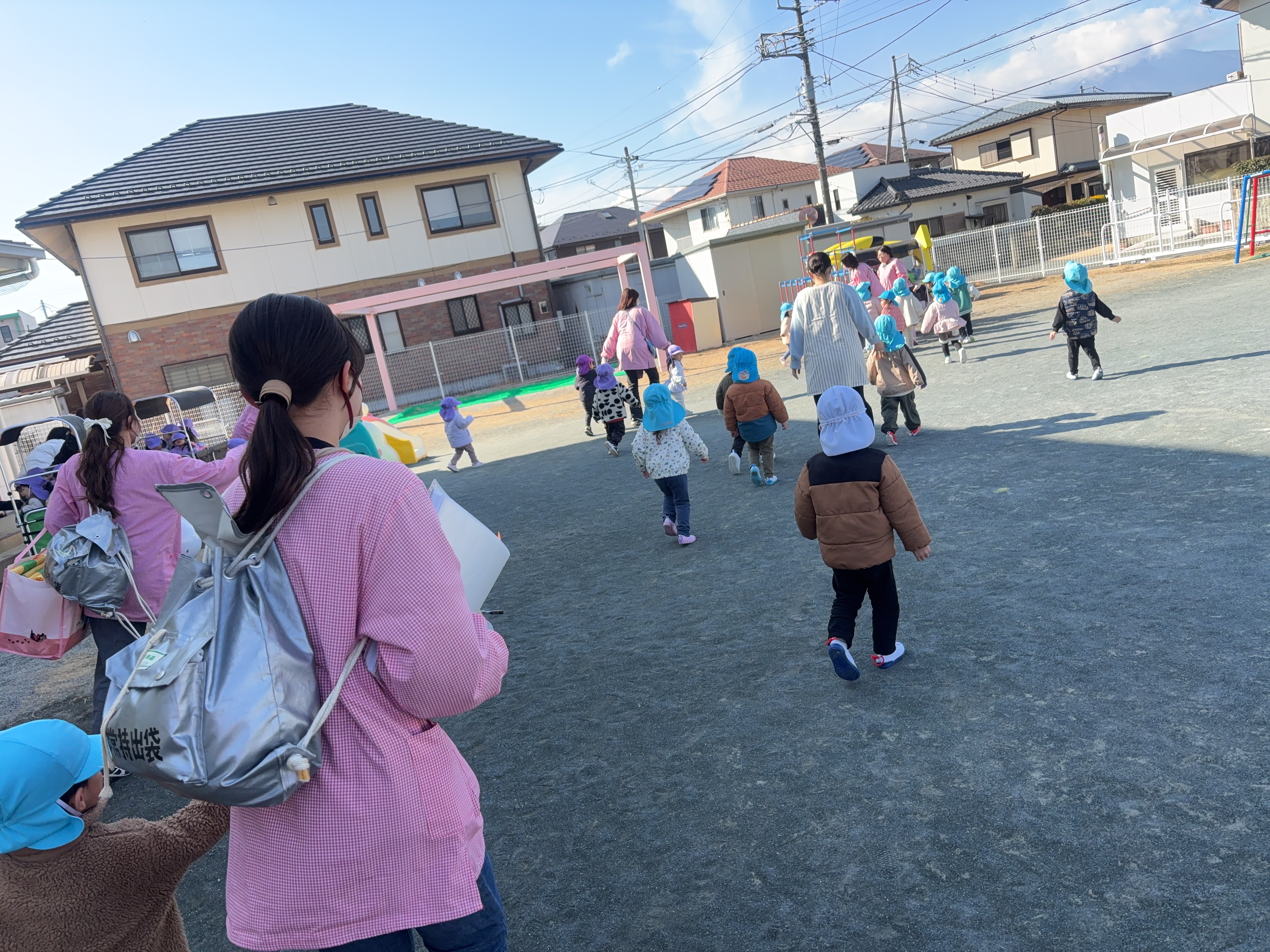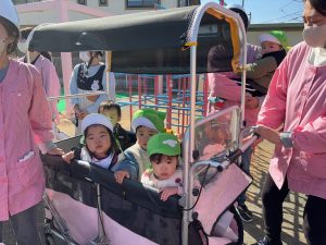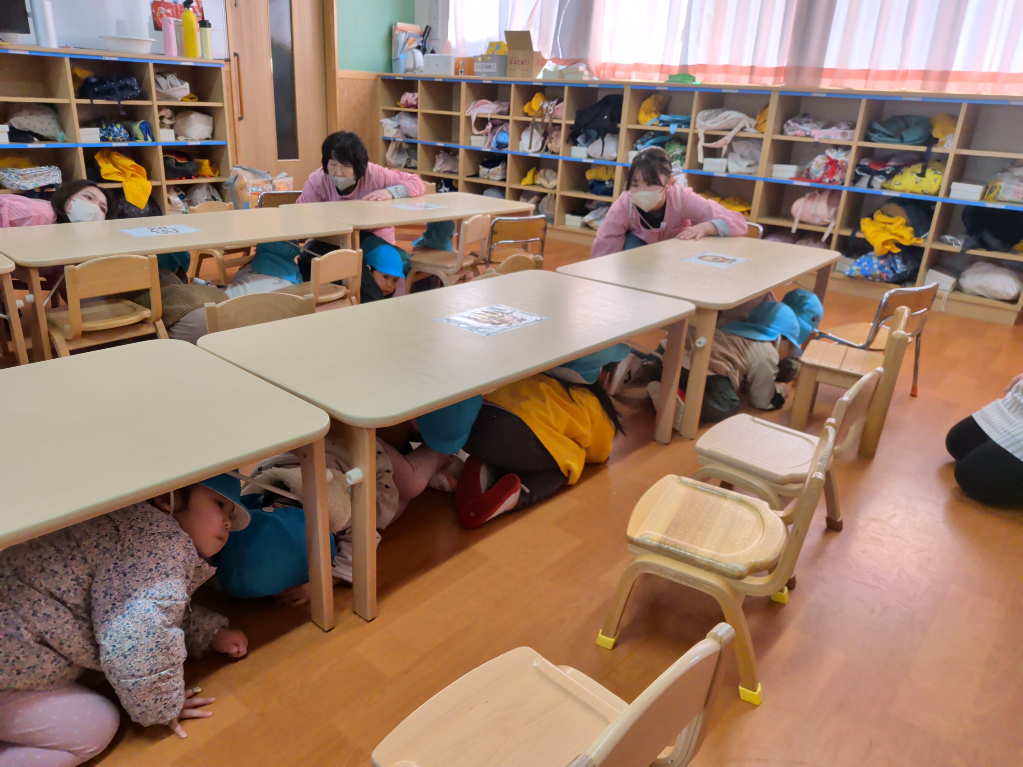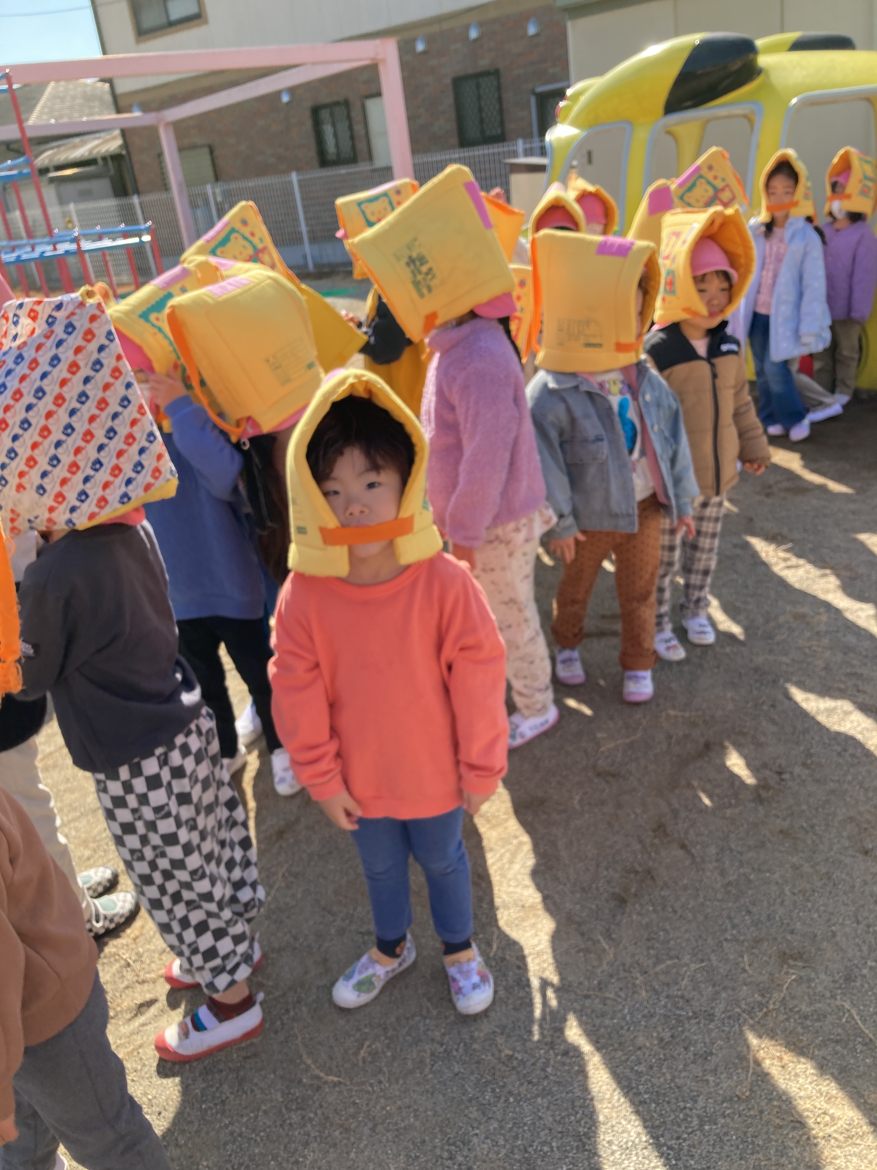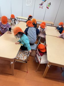 今月は、地震からの火災を想定した避難訓練を行いました。 いつもは、非常ベルの音で避難を開始しますが、今回は放送のみで訓練の指示をしました。不安で泣いてしまう様子もなく、どのクラスも落ち着いて避難することが出来ていました。
