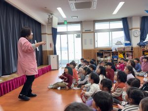 2月生まれの誕生会を行いました。今回は全クラスがひまわり組に集まってみんなでお祝いをしました。お友だちからの質問タイムでは「どんな食べ物が好きですか?」などかわいい質問が出てきましたが、一人ひとりしっかりと答えてくれました!