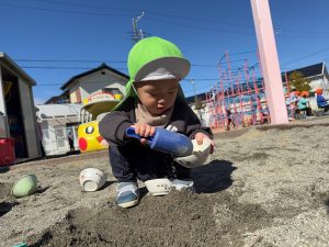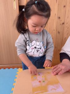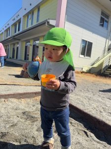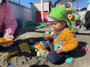 2月後半は暖かい日も多く戸外遊びを楽しむことができました。帽子を自分でかぶろうとしてみたり、玄関の靴箱から自分で靴を出してみたりと成長が感じられる場面もたくさんありました!