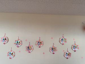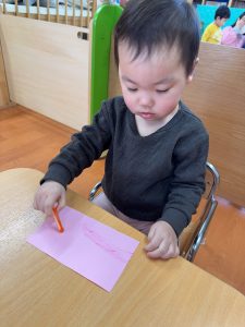 2月後半はお雛様を作って楽しみました。とっても可愛くできましたよ!「うれしいひなまつり」の歌を歌ったり、実際に飾ってあるお雛様を見ながら「これがぼんぼりだね」など確認をしてから作りました。最近では歌う時に語尾を大きな声で歌ったり、「ぼんぼり」や「もものはな」のなど歌えるとところもでてきましたよ。