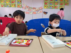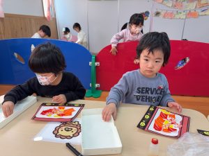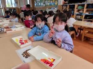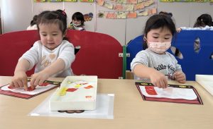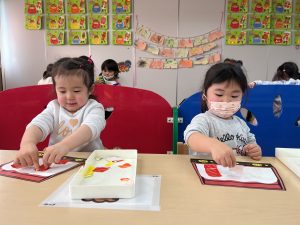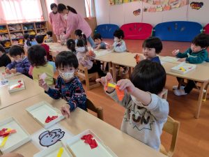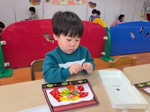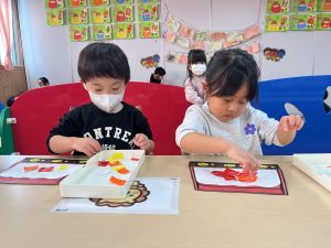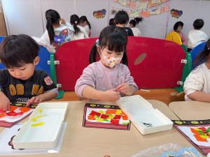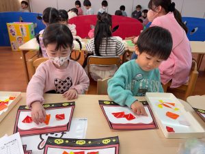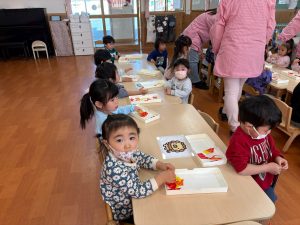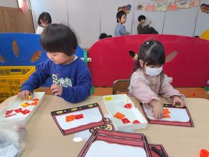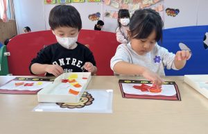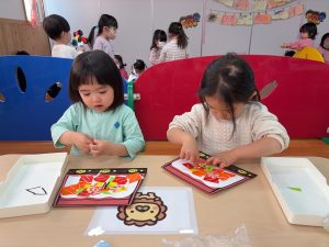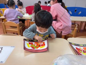 一斉での活動が少しずつできるようになってきた2組さん。今回は具材に見立てた折り紙をみんなでちぎりました!