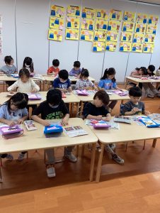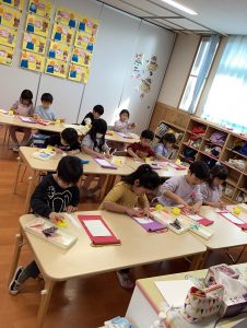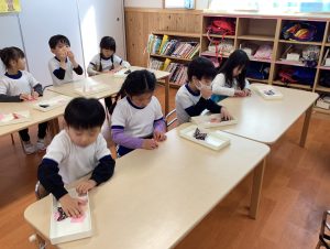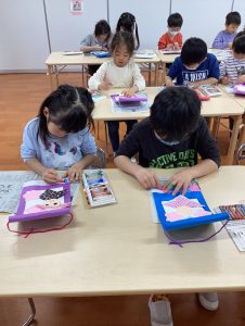 みんなで好きな色の掛け軸にお内裏様とお雛様を糊付けしていきました。