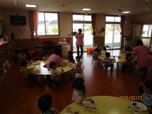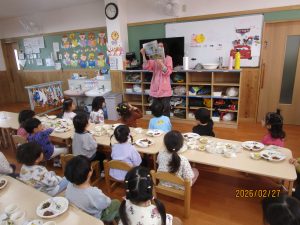 2歳児クラスのお友達は「おしえてくやさーい」って言ってるよ!と読み聞かせを真剣に聞いていました。