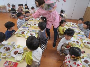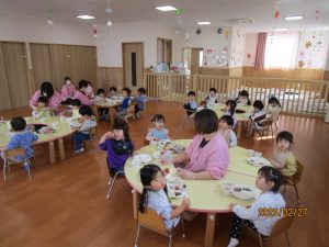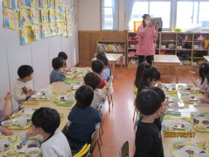 ひまわり組さんは、給食の中の野菜を見つけて「トマトあった!!!」