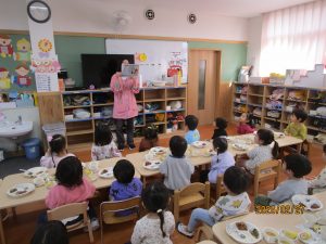 すみれ組さんでは、本を読み終えた先生が「〇〇さんの好きな野菜はなんですか?」と