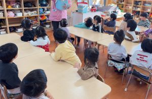 短いお話なので、つぼみ1組(1歳児)クラスにもお邪魔して読んでもらいました。