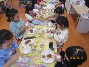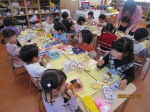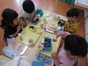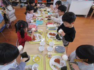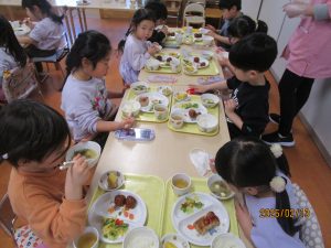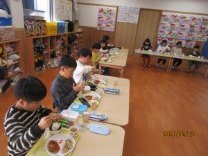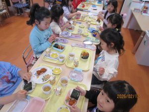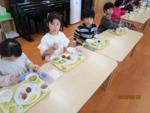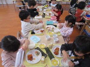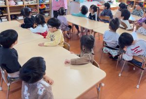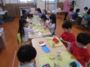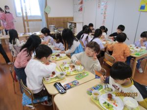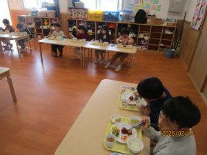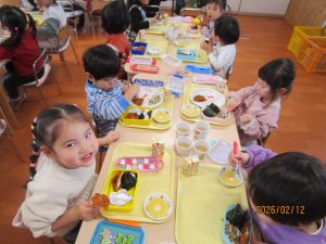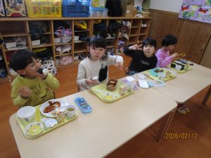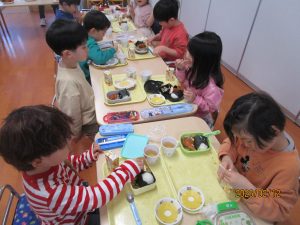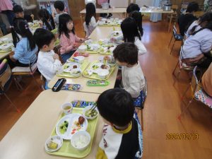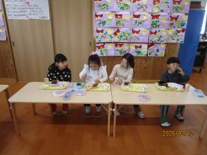 さくら組さんは、午前中の活動が充実していたため、いつもより遅めの給食に・・・。