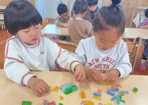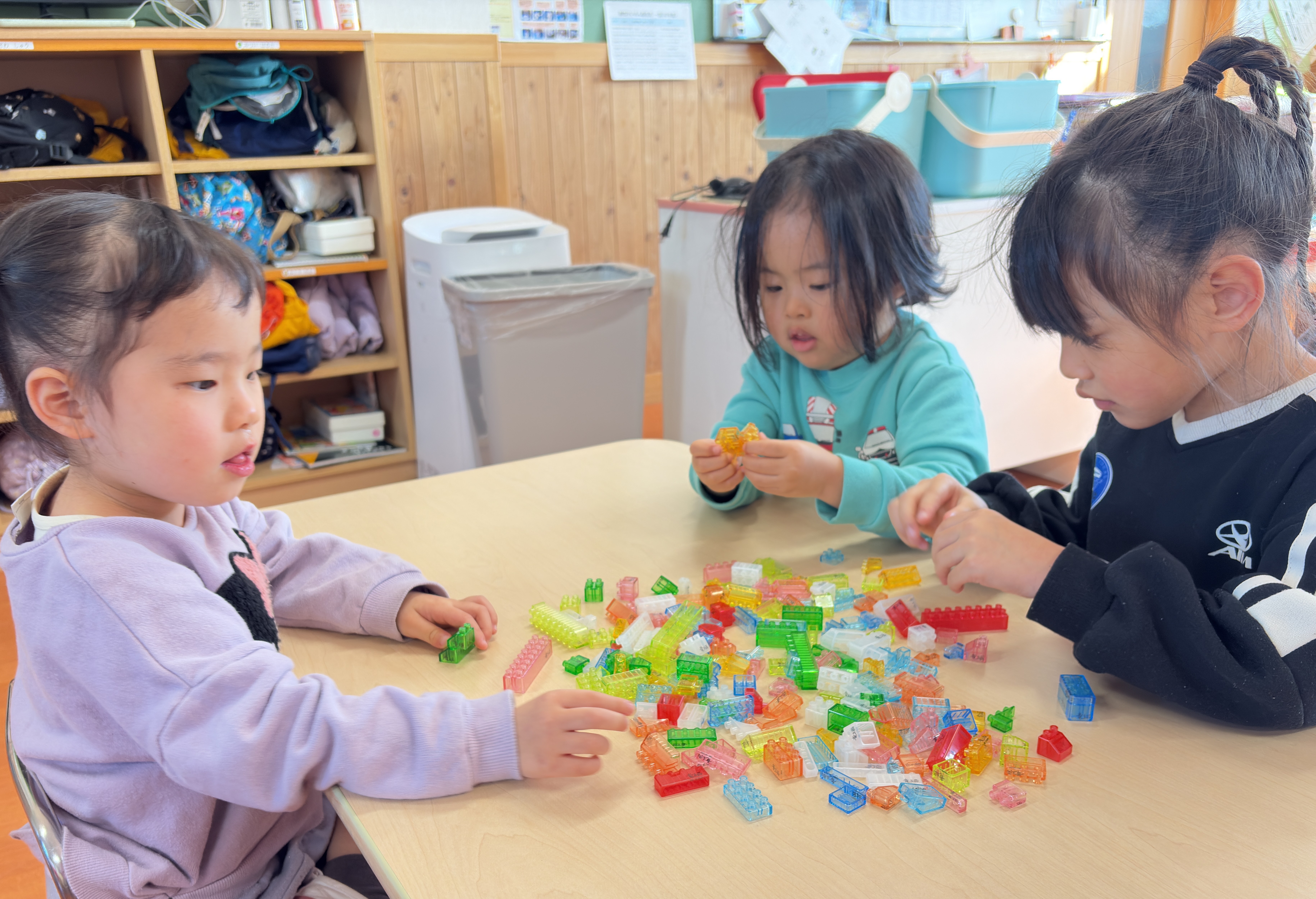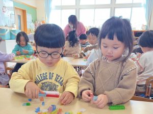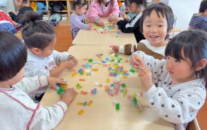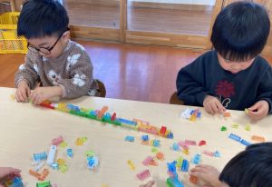 寒い日はお部屋で身体をマットなどで動かして遊んだり、クレヨン遊びをしたり、節分にむけて鬼のお面を作ったりしながら楽しく過ごしています。