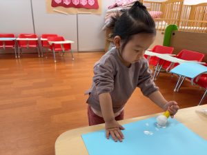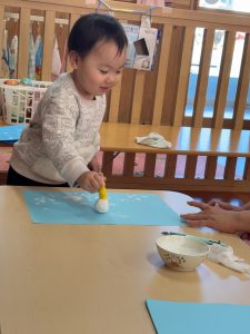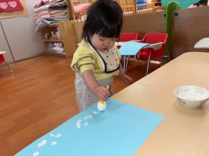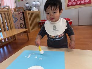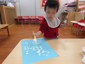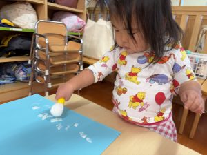先日は少し雪が積もりましたね。銀世界を初めて見た子もいたかもしれないですね。翌日には溶けてしまいましたが、たんぽで雪を紙に振らせてみました。みんな「ゆき」の歌に合わせてポンポンと楽し気でした。
