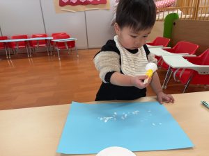その後は花紙をくしゃくしゃ丸めてのりでつけました。「くしゃくしゃってできるかな?」と保育者が声をかけると両手を使って丸めることができていました。