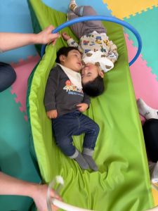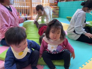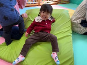 ゆらゆらマットや簡易滑り台などでお部屋でも沢山身体を動かして遊んでいますよ!