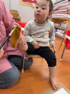 一人で履くのは難しいと感じると「せんせーい、きて!」と呼んでくれたり、履けると嬉しそうに見せてくれたりします。