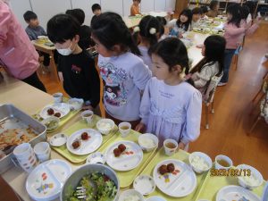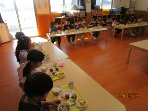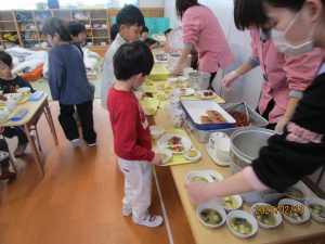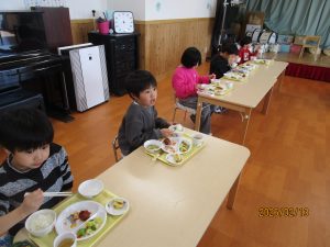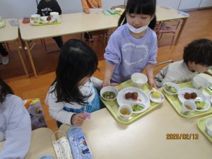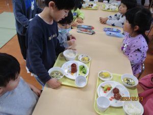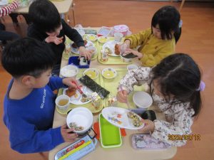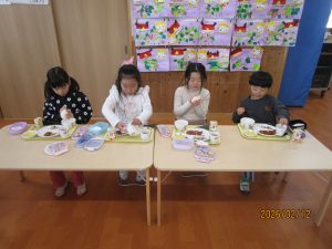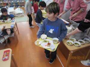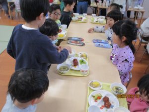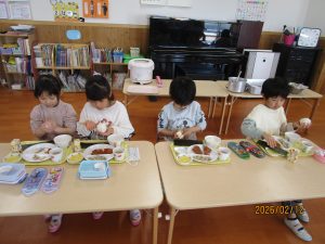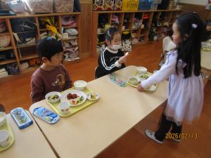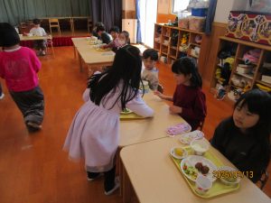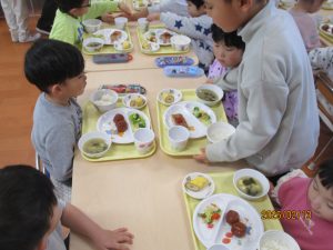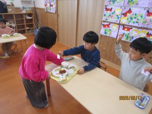 すみれ組さんには、ひまわり組のお兄さんたちがウェイター役になって配膳してくれました。