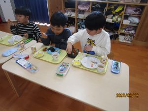 すみれ組さんは、おにぎりを握ってお弁当箱に詰めるのが上手になってきました。