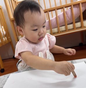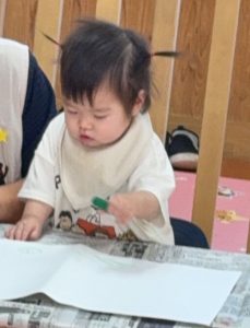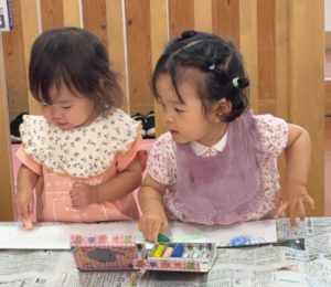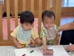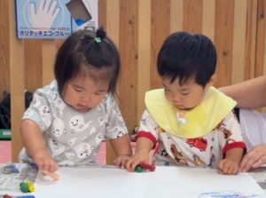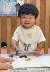 はじめてクレヨン遊びをしました。お家でよく描いている子もいれば、全くの初めての子もいましたが、クレヨンの感触を楽しむことができました!9月の製作として描いた絵が麦わら帽子の模様になりました!