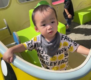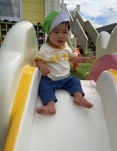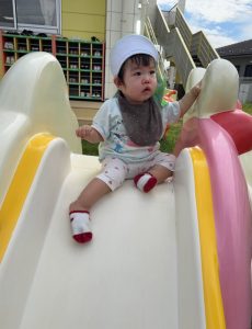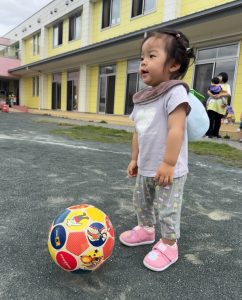 ようやく残暑もゆらいできて、戸外遊びを楽しめる季節になりました。一緒の時間に遊んでいる以上児クラスのお友達がとても優しくしてくれたりもしますよ!