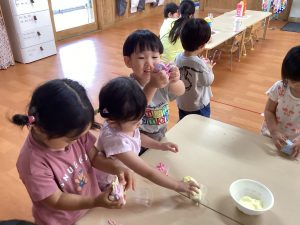 赤、黄、青のスライムを混ぜて、いろいろな色を作り、「紫はぶどう味!」「緑はメロン味!」と楽しそうにお話しする姿も見られましたよ〜!