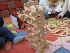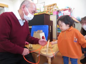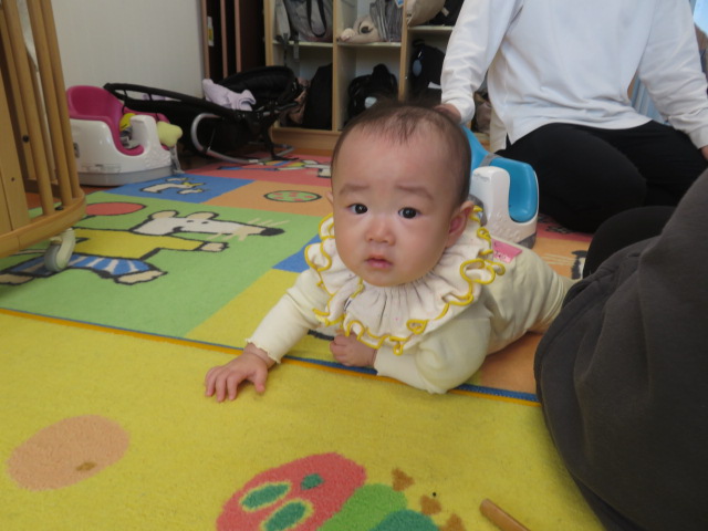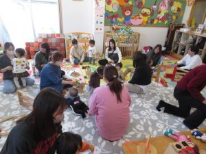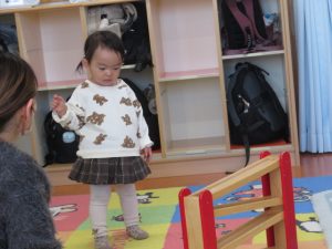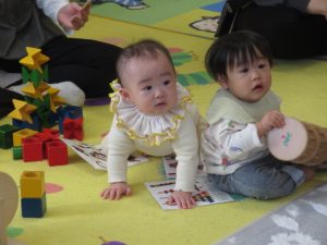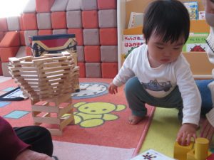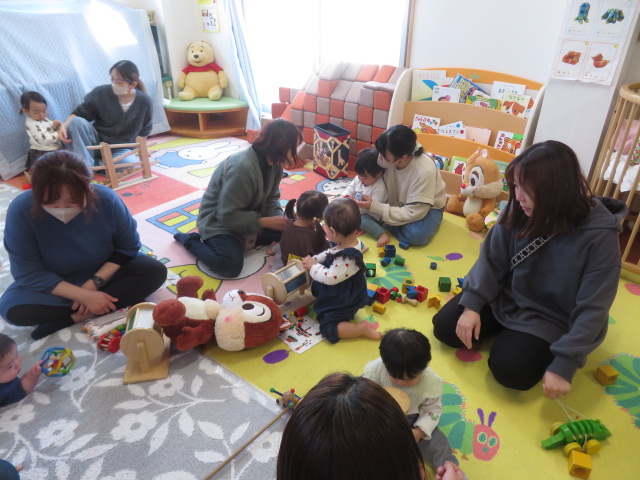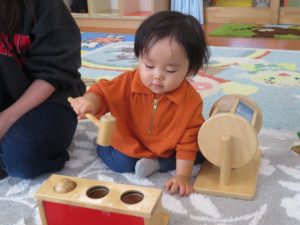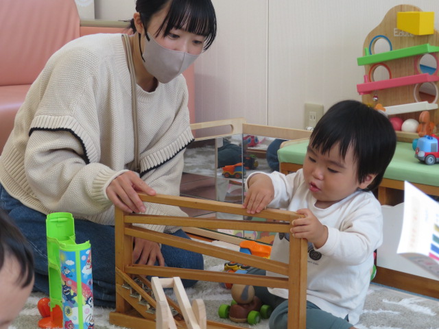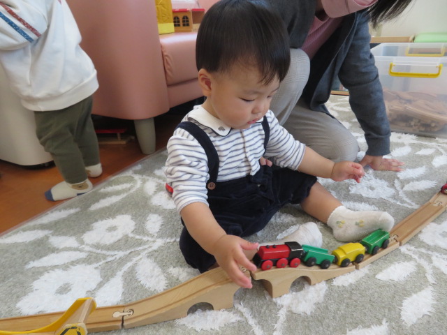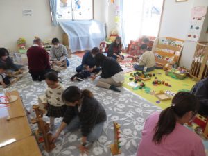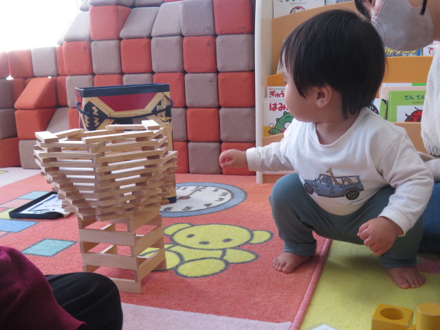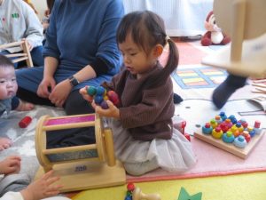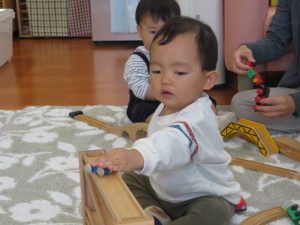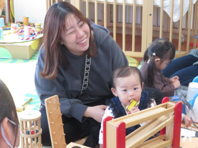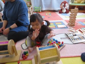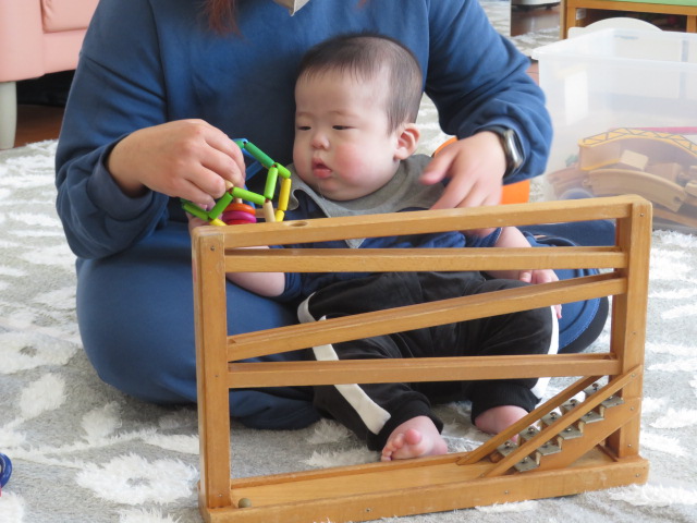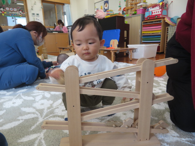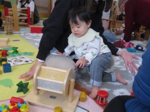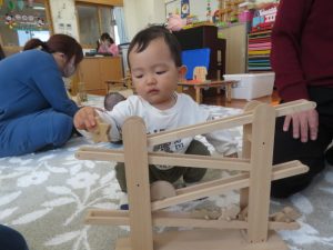 月齢の小さいお友達もぬくもりのある木のおもちゃに触れ、
