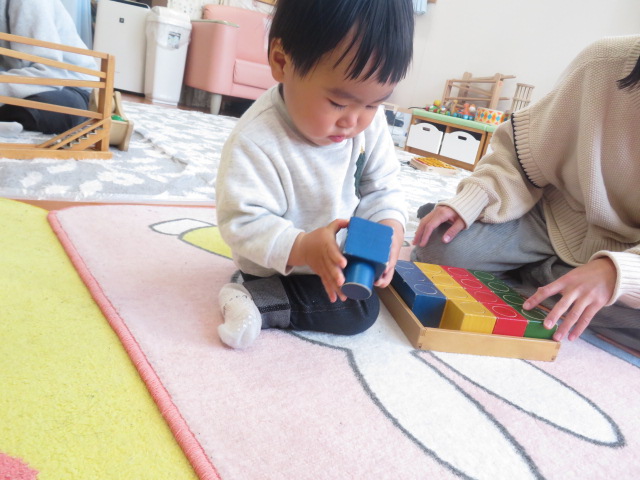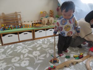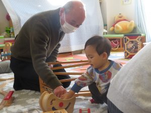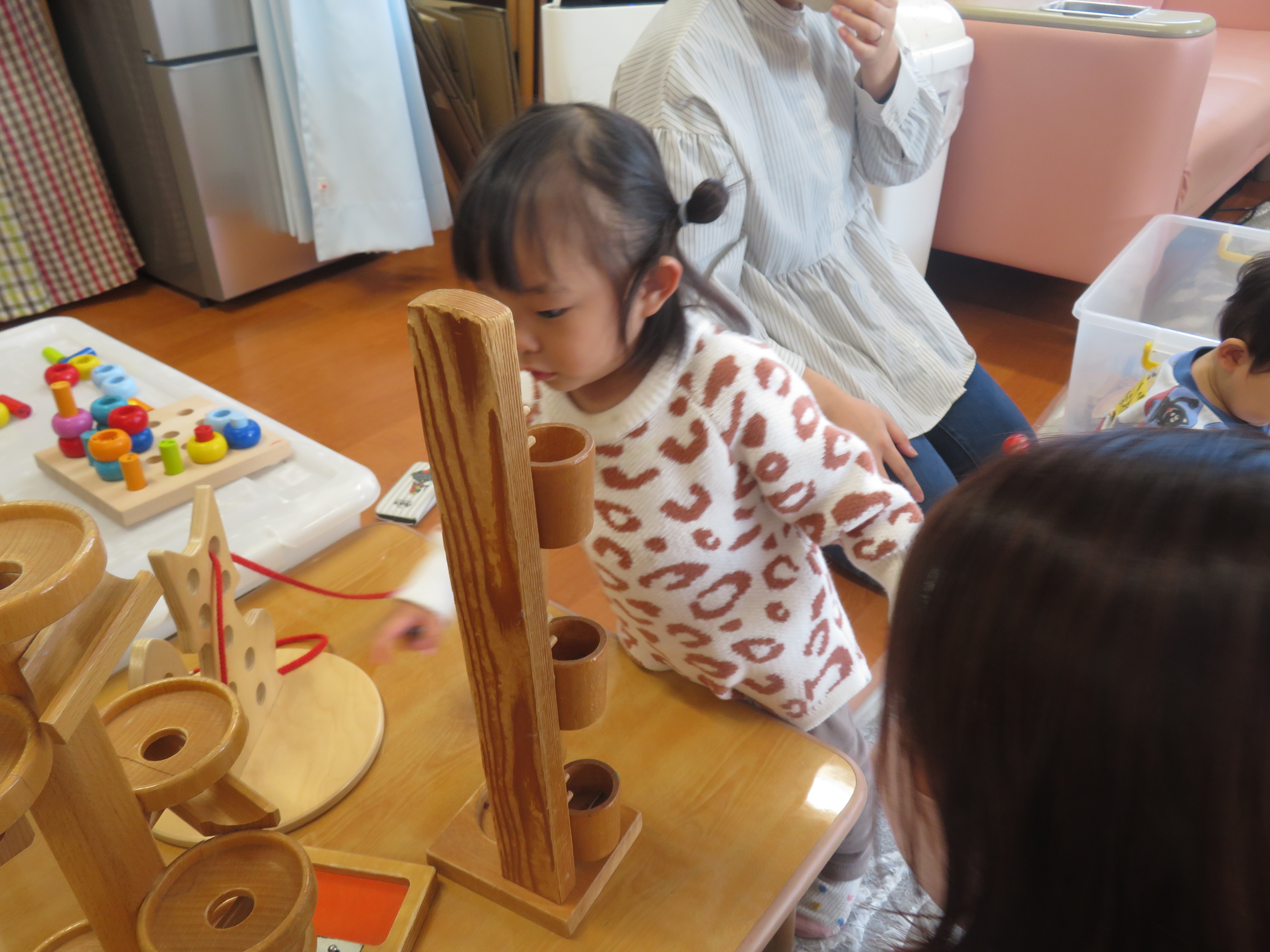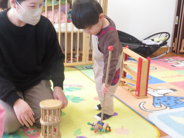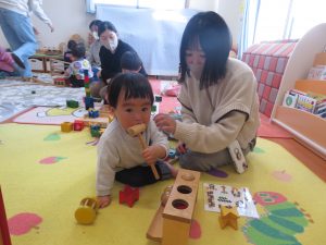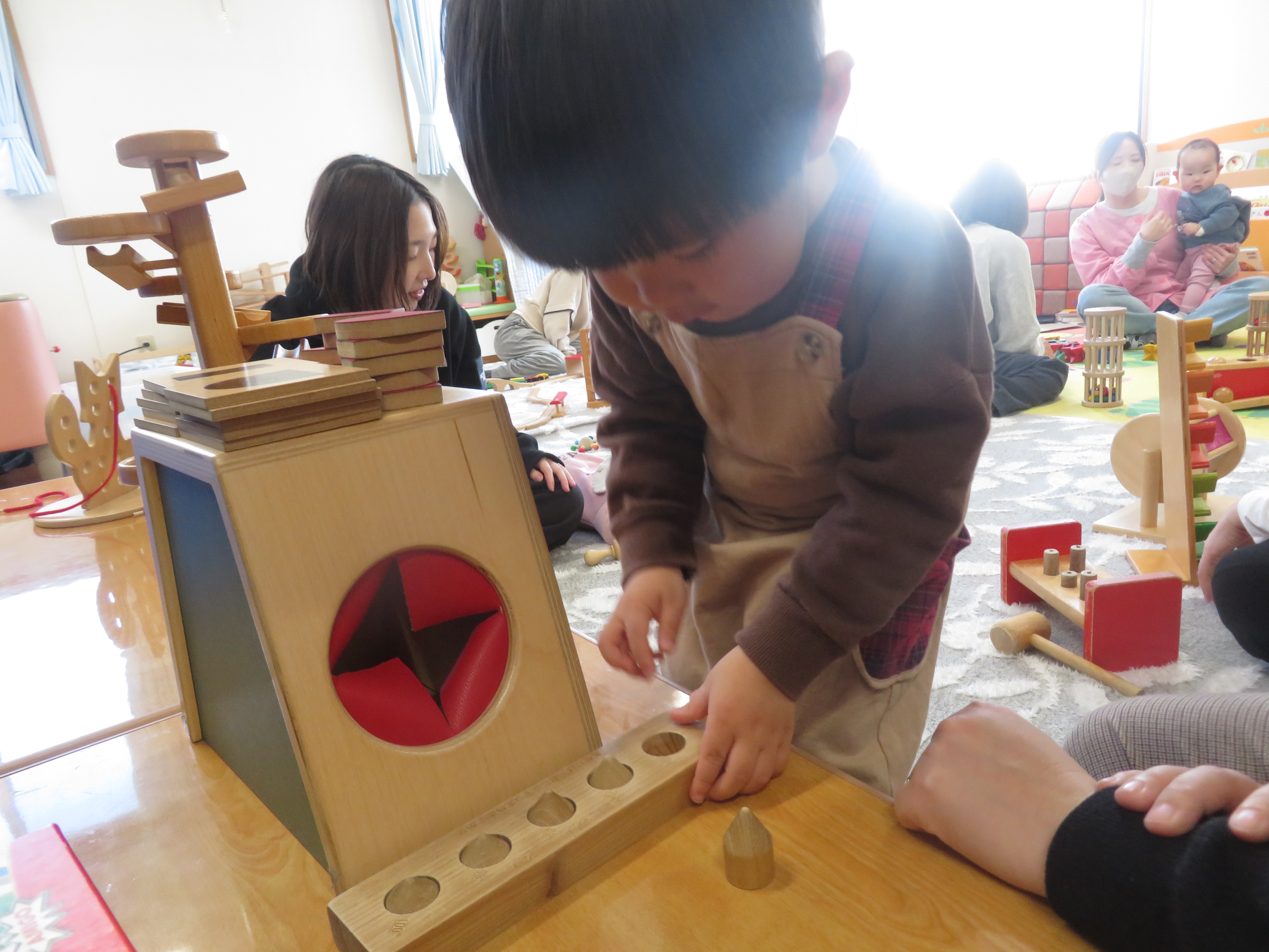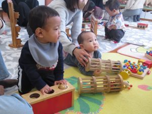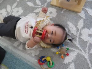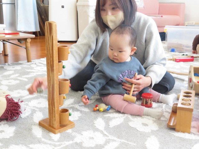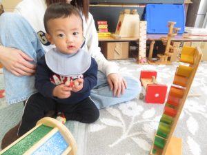 月齢に合った木のおもちゃを山田さんが出してくれ