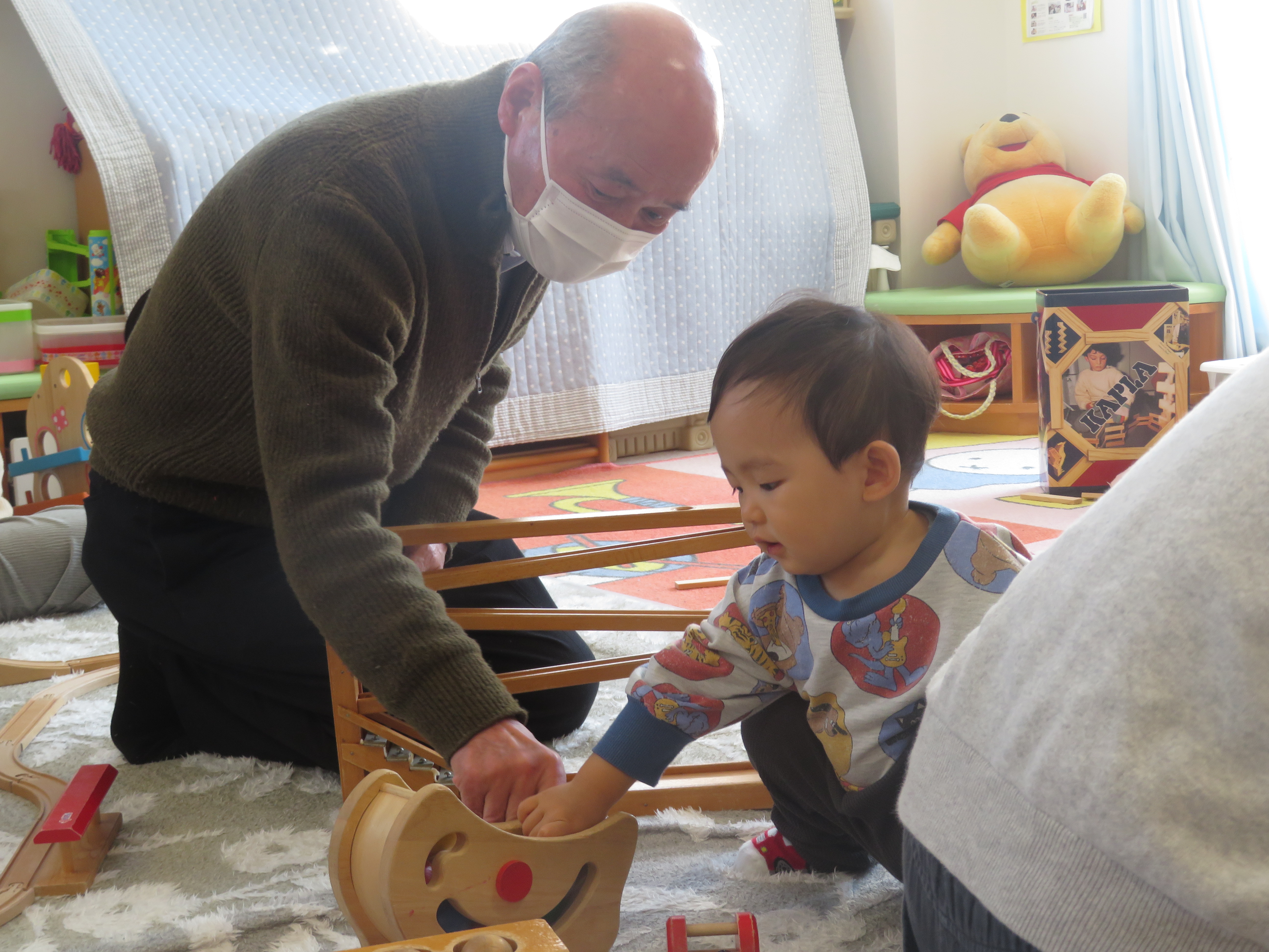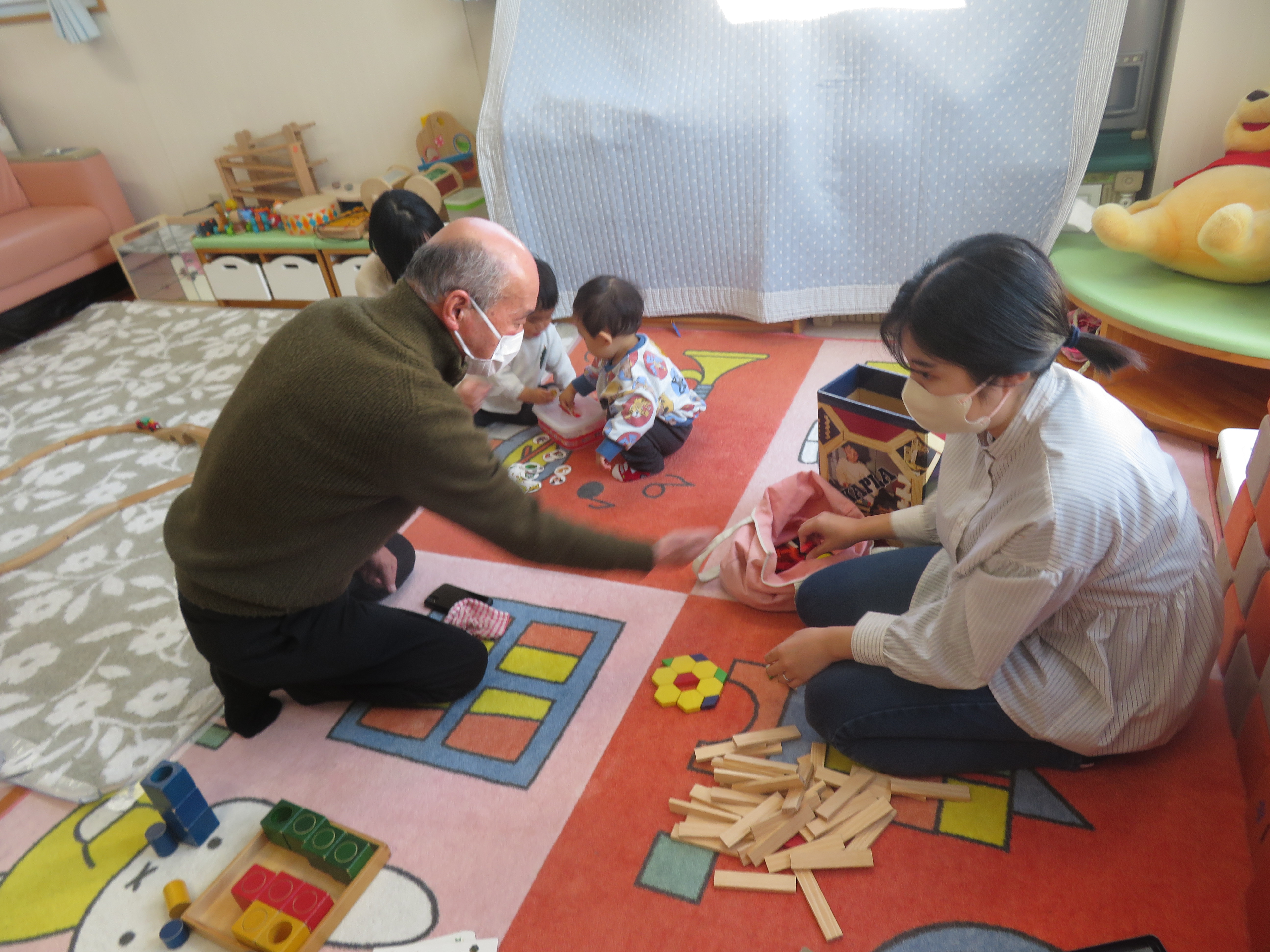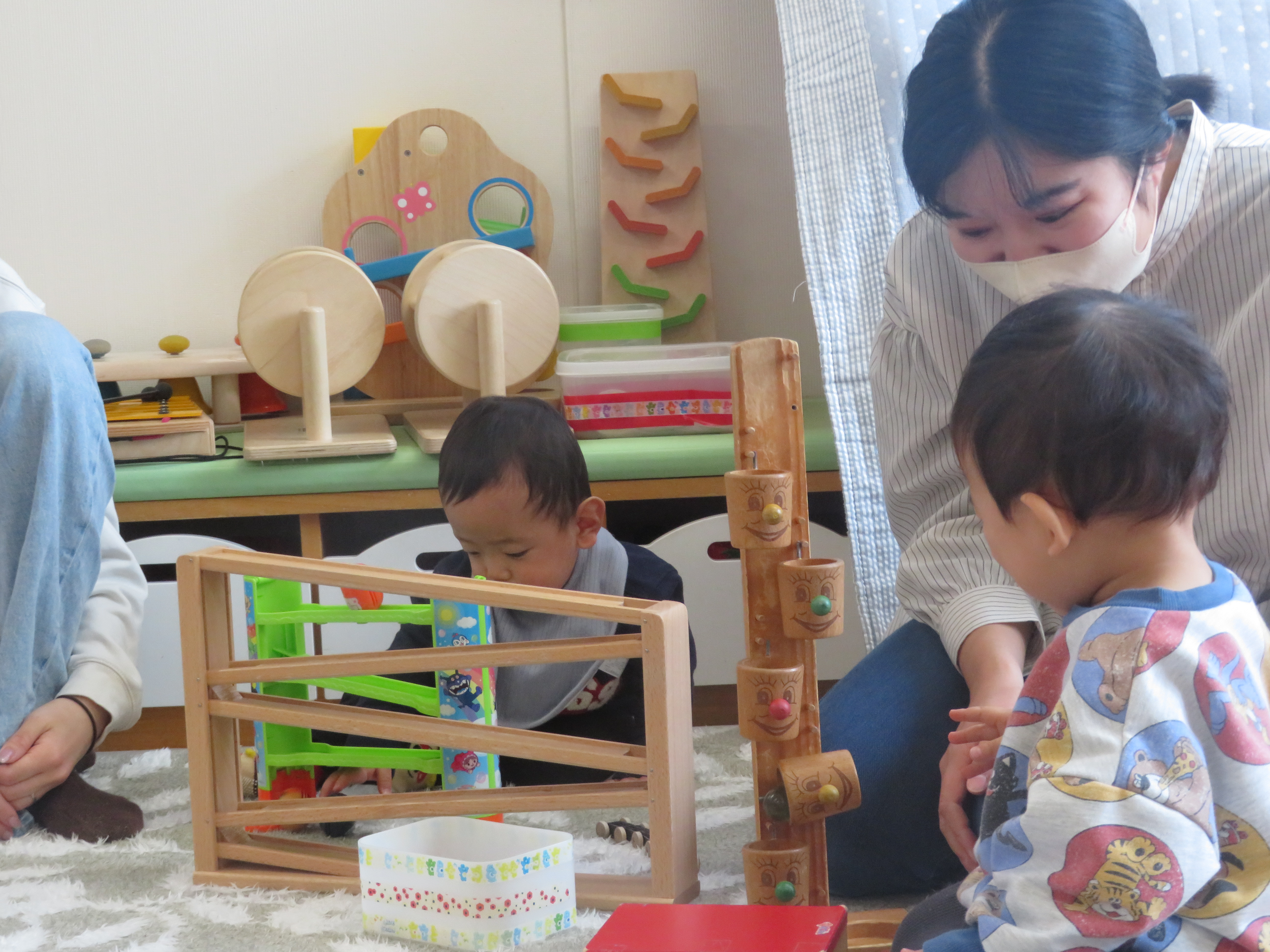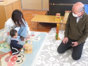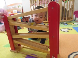 月齢に合った木のおもちゃを山田さんが出してくれ