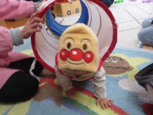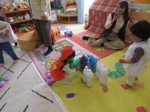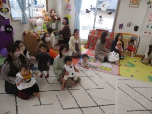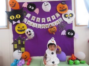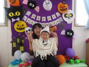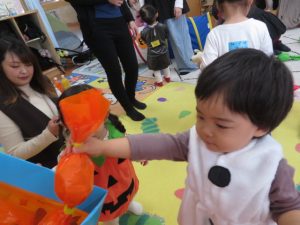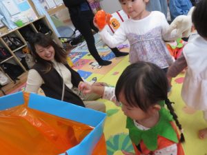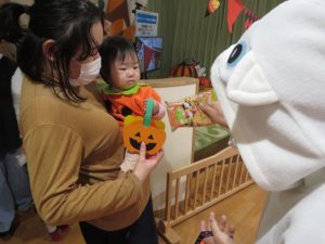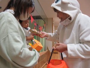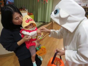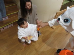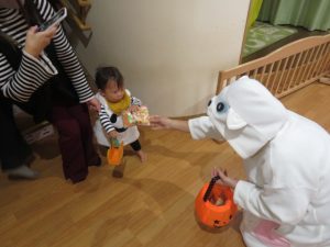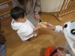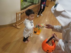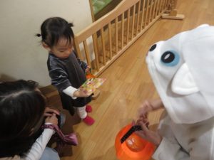 仮装している先生にびっくりしながらも、笑顔でお菓子を