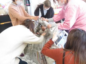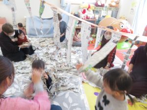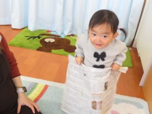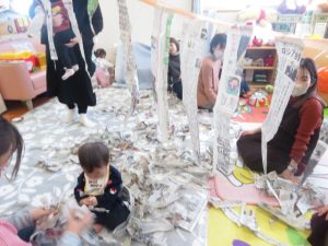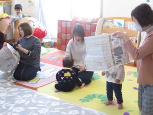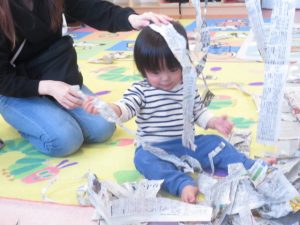 新聞紙をお洋服に見立てて遊ぶ姿もみられました♡