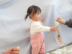 ママと一緒に新聞紙でいないいないばあを楽しんだり