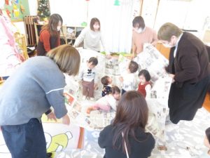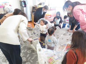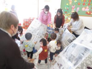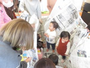 最後に大きな新聞を用意して、新聞で包みいないいないばあとすると