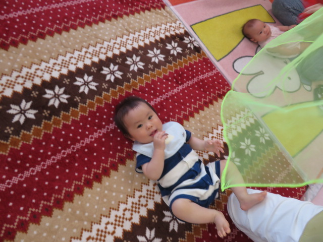 がんばって身長と体重を図りました。立っちのできるお友だちも、ねんねのお友だちも計測器に乗ってできました。じっとしていられず測りなおしもあったけど、頑張りましたね。ママたちのお話も色々な情報交換ができたようでした。