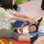 赤ちゃんのうちに、ハイハイをしたりころがることを沢山やっておくと、体を護ることができる様になり怪我をしなくなります。今日は、そんな身近な運動をたくさん教えていただき親子で楽しみました。足の間をハイハイ!ママのお膝でくるりんぱ!バランスボールの上でジャンプジャンプ! くるりんぱにはママたちも「え~すご~い!そんなこと出来るの~。」と恐々やりました。みんなが初めてのことに挑戦できて、沢山拍手をしてもらえ、とても楽しい時間を過ごせました。お家でもできるといいですね~。
